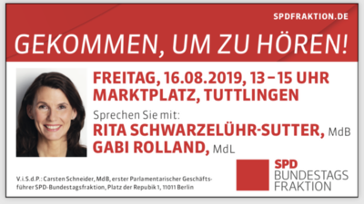 Am Freitag, dem 16. August 2019 macht das Info-Mobil der SPD-Bundestagsfraktion in Tuttlingen Station. Von 13 Uhr bis 15 Uhr steht das Mobil auf dem Marktplatz vor dem Rathaus. Unter dem Motto "gekommen, um zu hören!" steht unsere Betreuungsabgeordnete und Parlamentarische Staatssekretärin Rita Schwarzelühr-Sutter sowie unsere umweltpolitische Sprecherin der Landtagsfraktion Gabi Rolland für Gespräche zur Verfügung.
